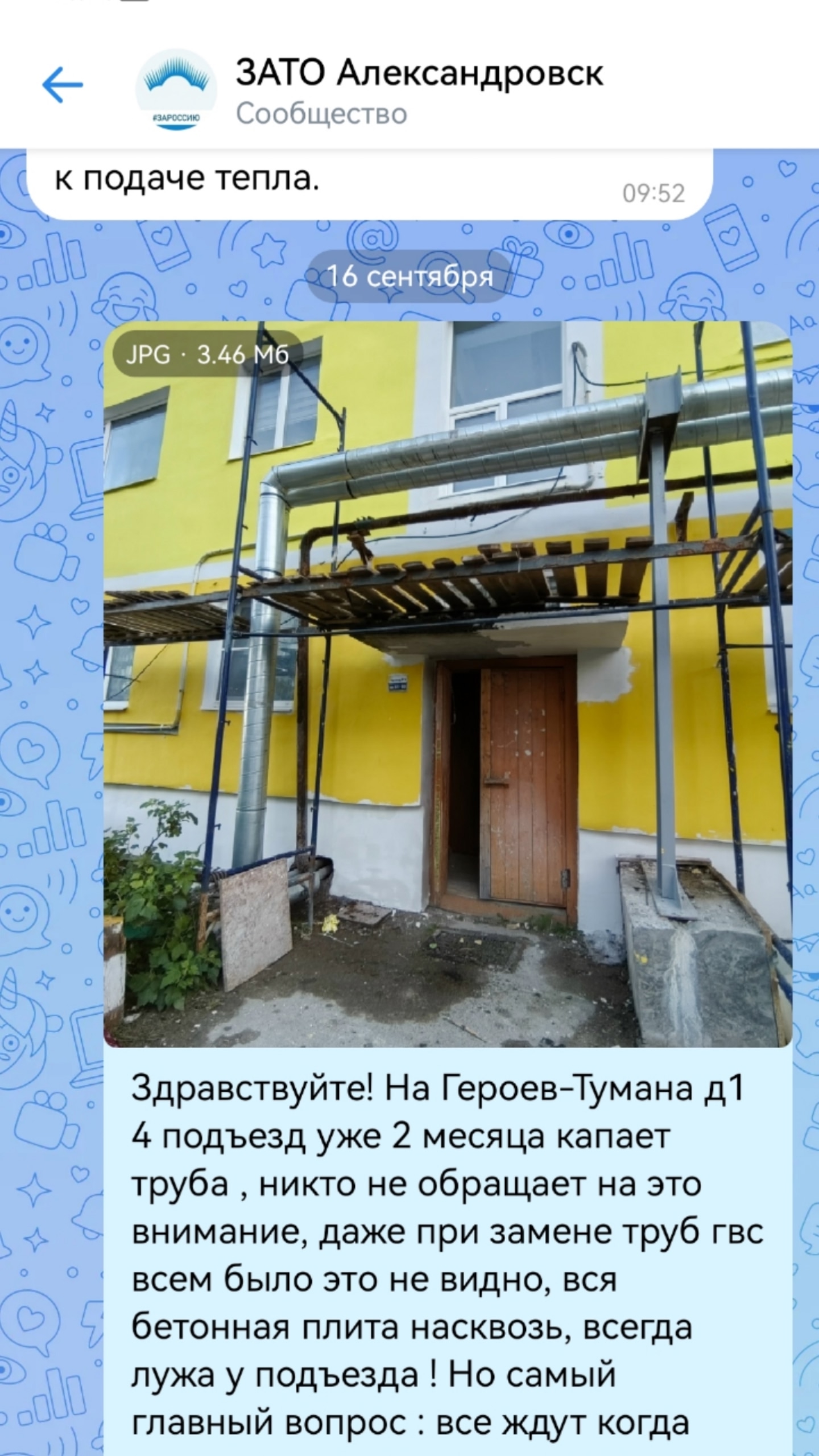 «Я им писала 16 сентября, сказали, займутся в конце октября (если она доживет, так как капает где-то с июня месяца), а это значит, что когда будут заморозки, она просто может не выдержать», — подтвердила комментарии Елена Михалева из Полярного.