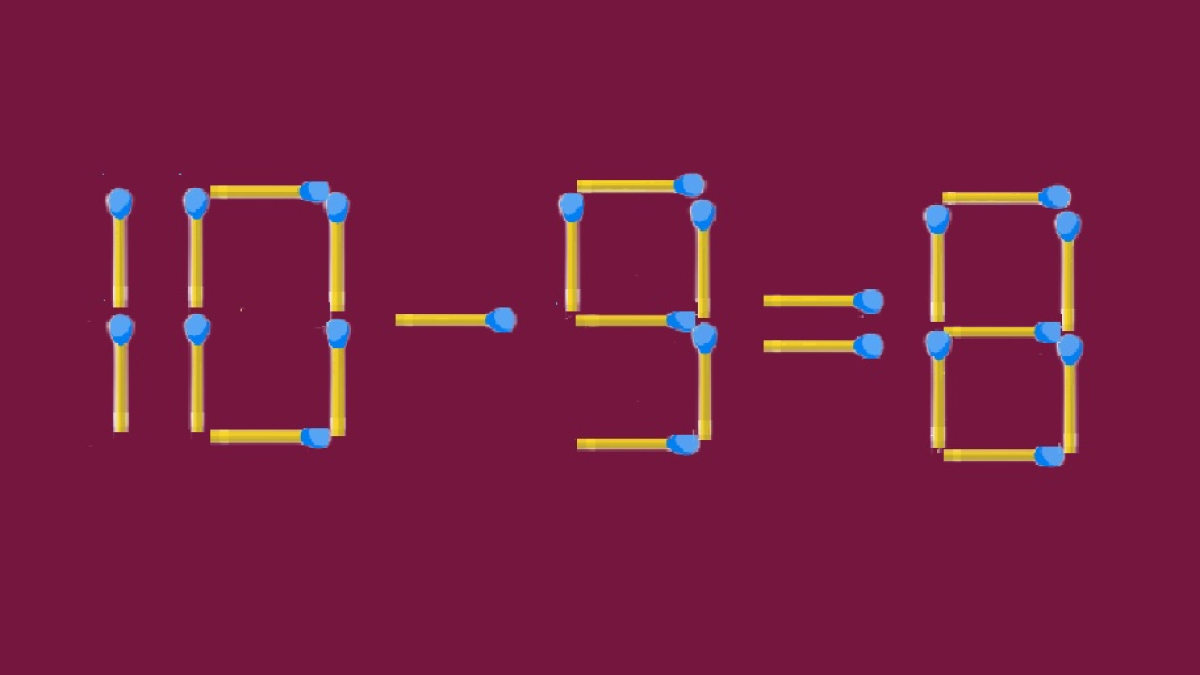 Внимание на иллюстрацию, равенство «10-9=8» ждет ваших действий. Вычисления выполнены не верно, придется их исправить. Но передвинуть разрешается всего одну спичку, проявите себя.