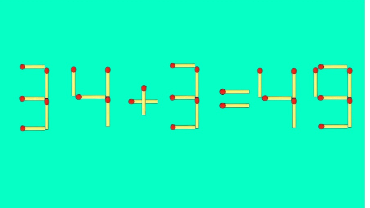 На иллюстрации вы видите равенство «34+3=49», которое никто не назовёт верным. Нам повезло, что запись составлена из спичек. Достаточно переместить всего одну деталь, и правила математики будут соблюдены.