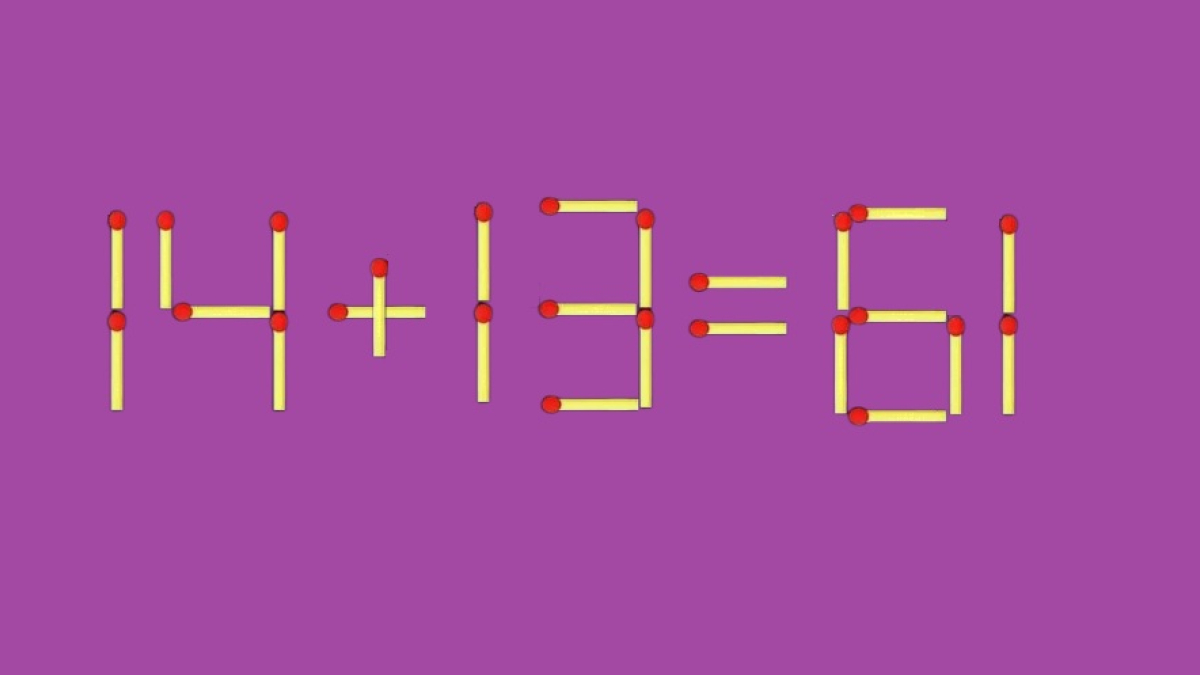 Предлагаем вам справиться со спичечной перестановкой. Классическая головоломка ждёт вас на иллюстрации. Равенство «14+13=61» собрано неверно, но ошибку в записи несложно исправить. Передвиньте всего один элемент, и пример станет корректным.