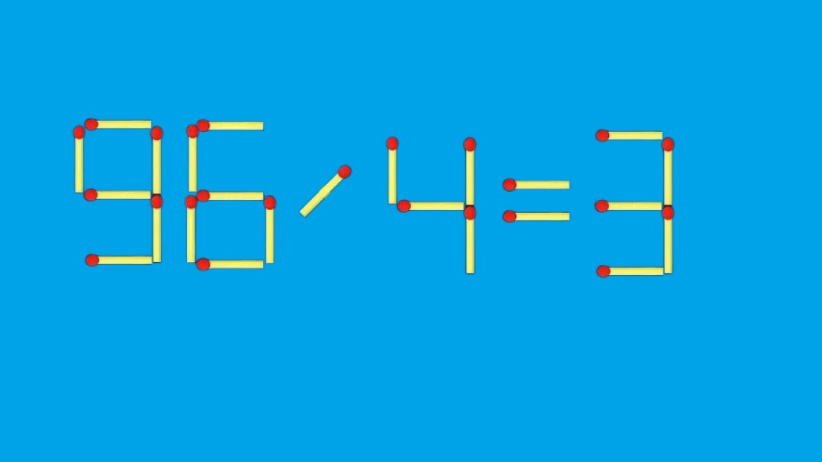 Предлагаем вам поменять в этой записи две цифры местами, не нарушая правила игры. Просто перенесите спичку из девятки в тройку, и равенство «36/4=9» не будет вызывать сомнений.