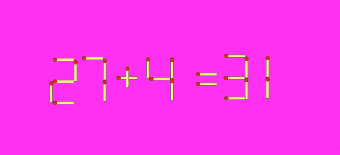 Как видите, одного умения считать здесь мало, потребуется творческий подход и пространственное воображение. Верным шагом станет превращение ответа в число «31», а свободную спичку направим на исправление действия. Свеженькая запись «27+4=31» радует глаз.