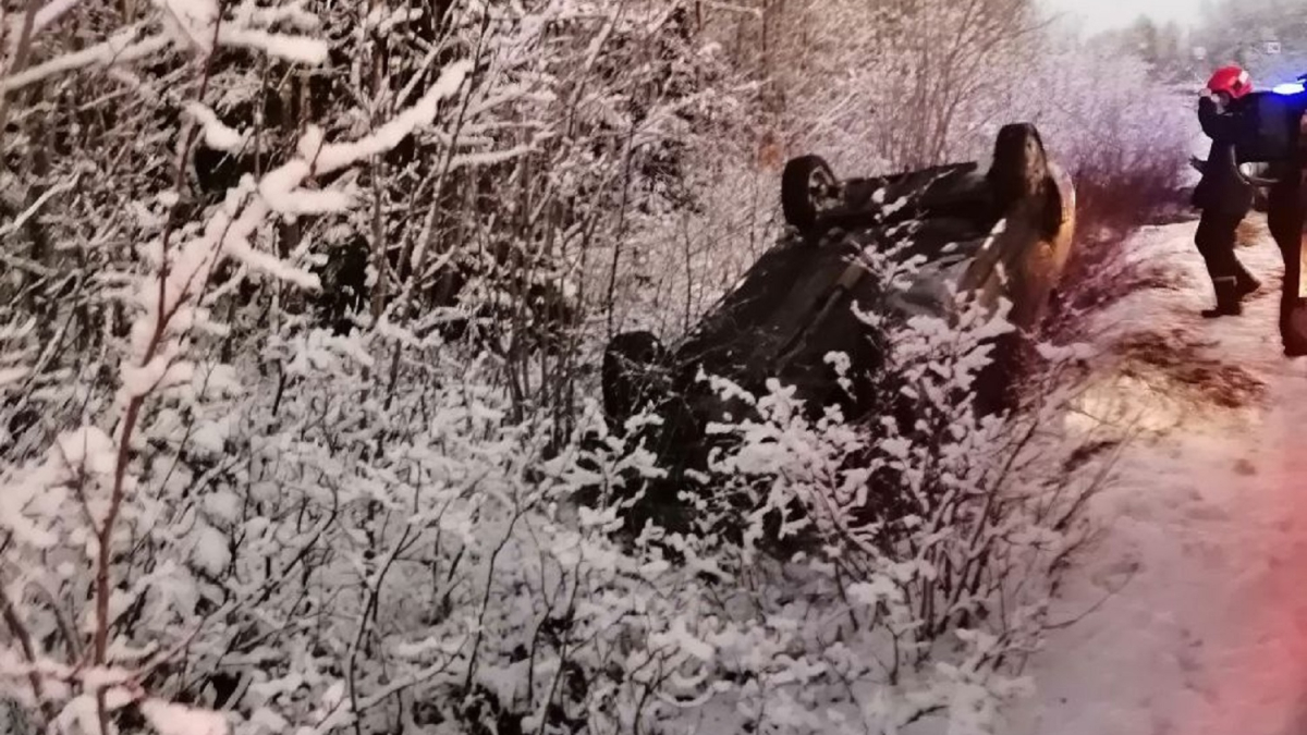 В Кольском округе ликвидированы последствия ДТП. С трассы съехала в кювет и перевернулась Лада Приора.