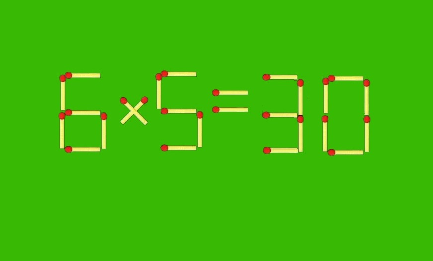 Если вы дружите с таблицей умножения, то догадались, какая запись нам пригодится. Сперва забираем спичку из ответа, а потом превращаем «5» в «6». Посмотрите на верное равенство «6×5=30», такая история всех устраивает.
