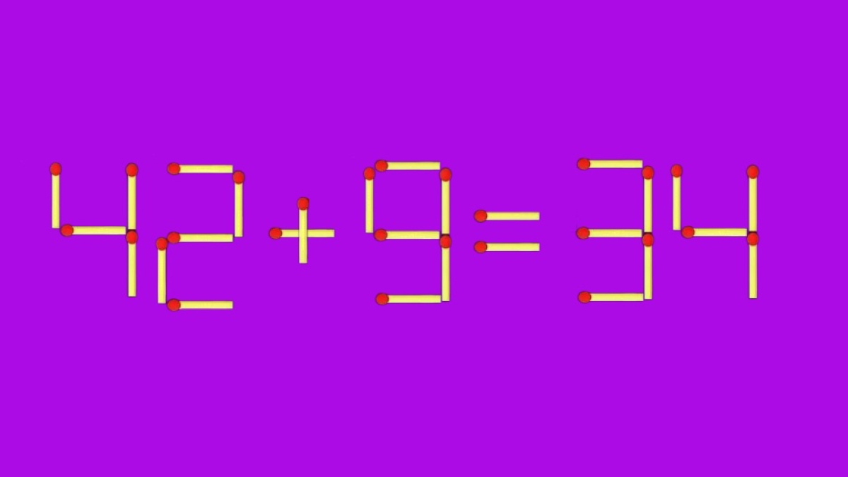 На иллюстрации вас ждёт равенство «42+9=34», в котором намеренно допущена ошибка. Проявите фантазию и переместите одну спичку так, чтобы запись стала верной. Только люди с высоким интеллектом способны на такое.