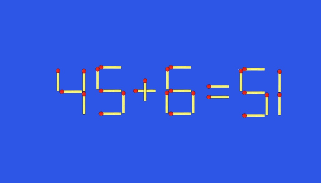Все не так сложно, как кажется сначала. Заберите спичку из ответа и поменяйте с её помощью второе слагаемое. Отличная запись «45+6=51» получилась у самых настойчивых личностей.
