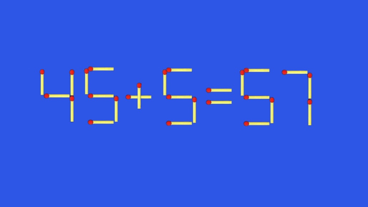 Представляем вашему вниманию равенство на иллюстрации. В пример «45+5=57» явно закралась ошибка, давайте это исправим. Переместите всего одну спичку так, чтобы пример решался верно. вам это по силам!