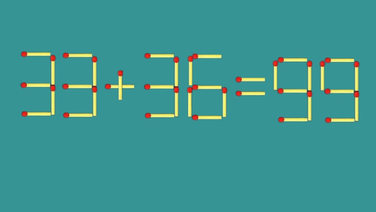 Внимание на иллюстрацию, вас ждёт хитрое равенство. В пример «36+33=99» закралась ошибка, давайте исправим запись. Достаточно передвинуть всего одну спичку, и вычисления станут верными. Проявите себя.