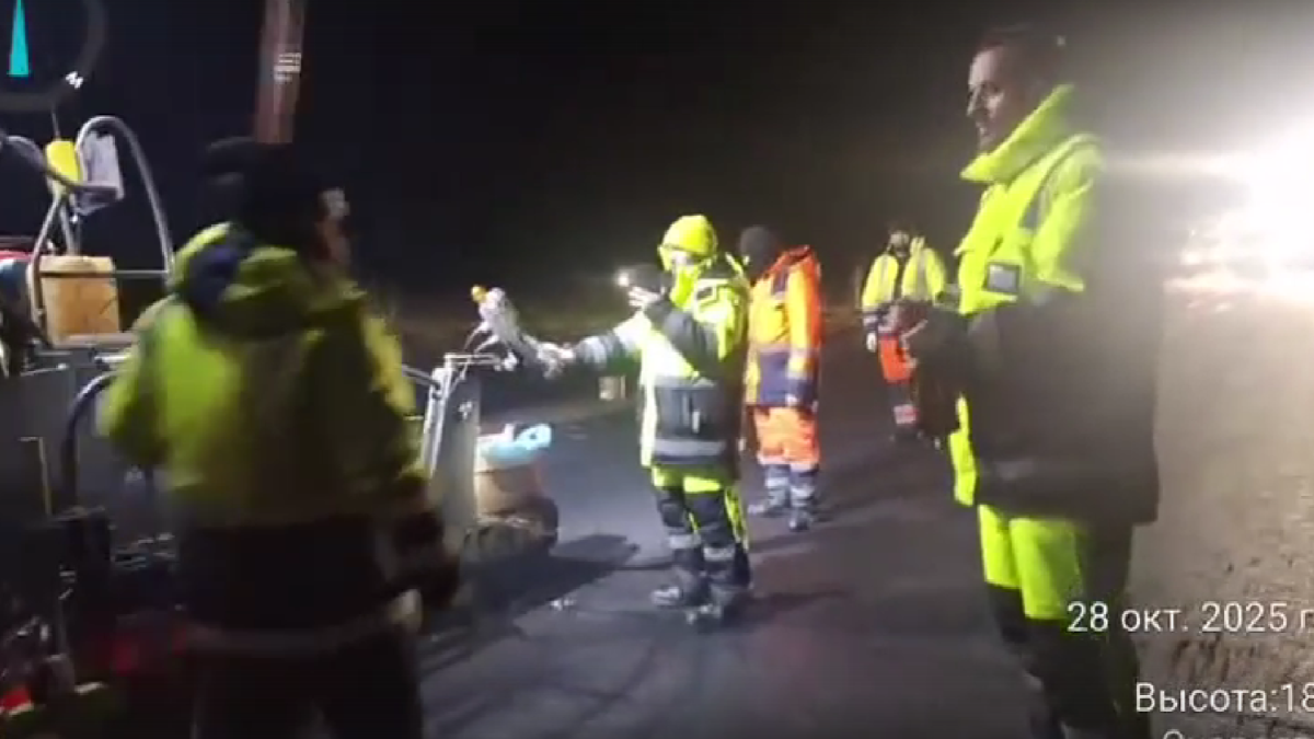 На видео видно, как рабочие возле спецтехники фотографируют обновленное дорожное покрытие.