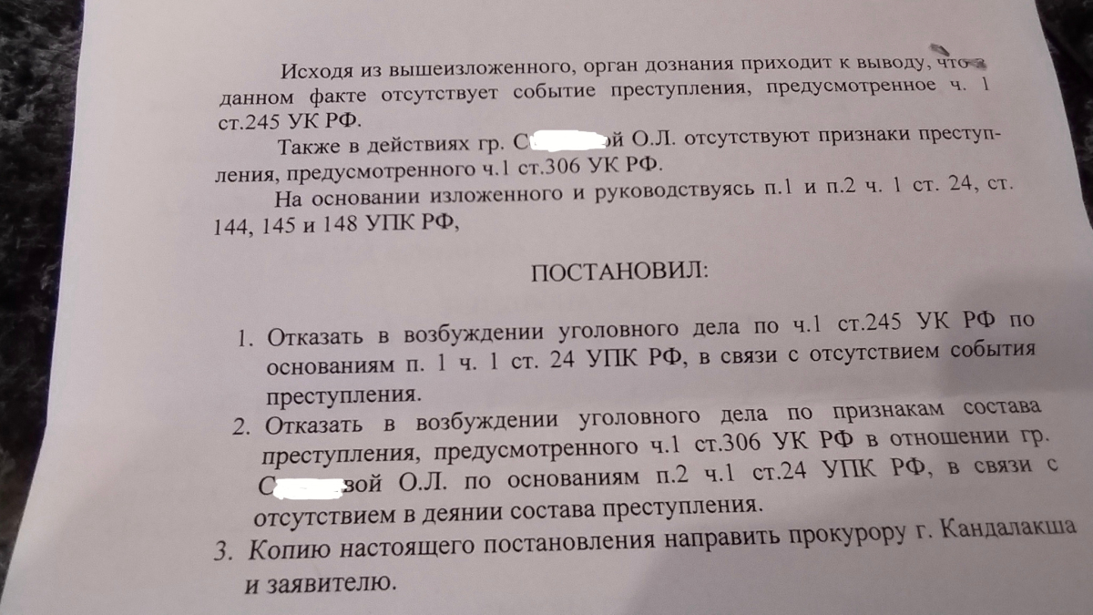 Стали известны итоги нашумевшей летом жуткой истории с повешенными собаками в лесу под Кандалакшей: полиция отказала в возбуждении уголовного дела. Причина — «отсутствие события преступления». Об этом сообщили зооволонтеры в паблике «Вагончик «Собачий ангел». Кандалакша», выложив официальный ответ.