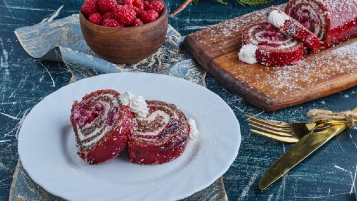 Размораживаем 2 квадратных пласта слоённого теста. Раскатываем один пласт в прямоугольник, посыпаем сахаром. Выкладываем замороженные ягоды. Сворачиваем большой в рулет и разрезаем на маленькие рулетики толщиной 2-3 см.