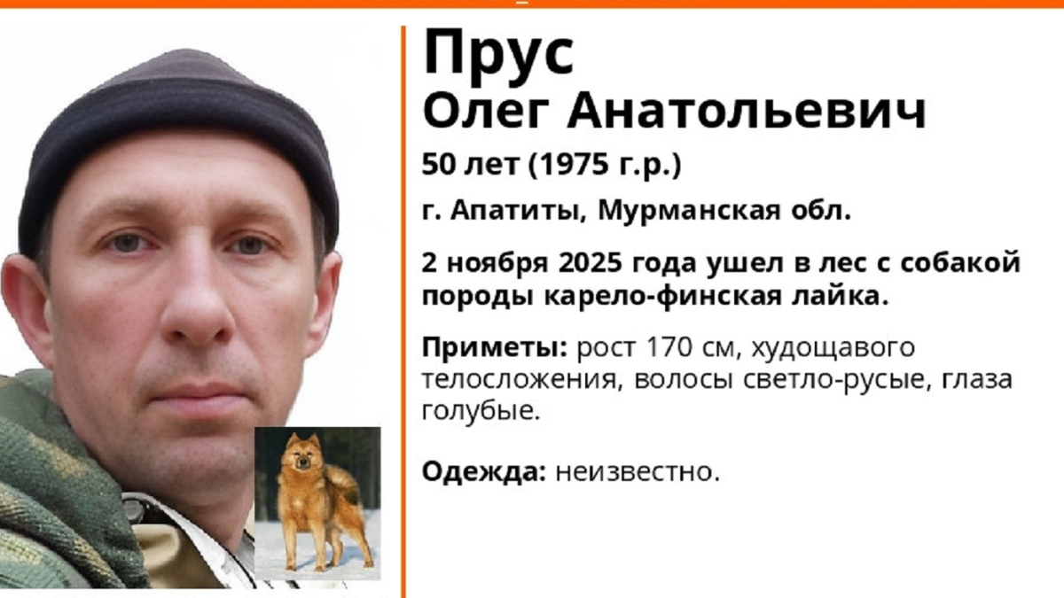 Со 2 ноября неизвестно место нахождения 50-летнего жителя города Апатиты Олега Пруса. Он ушел в лес с собакой породы карело-финская лайка, но домой не вернулся.