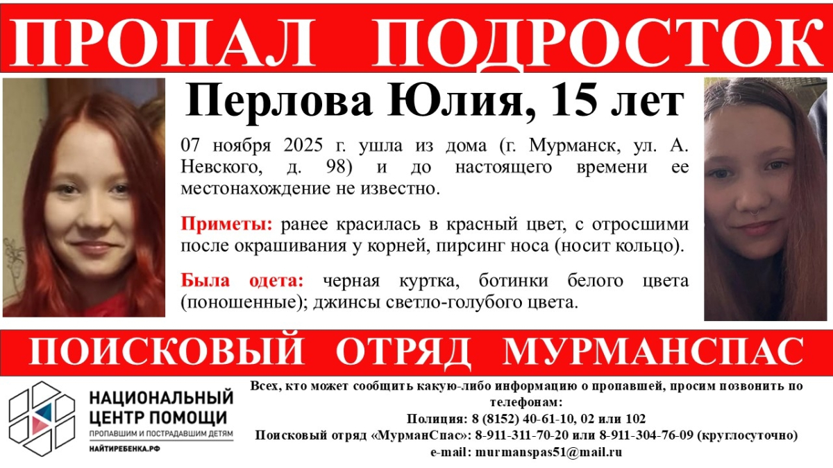 В Мурманске пропала 15-летняя Юлия Перлова, сообщают волонтёры поисково-спасательного отряда «МурманСпас».