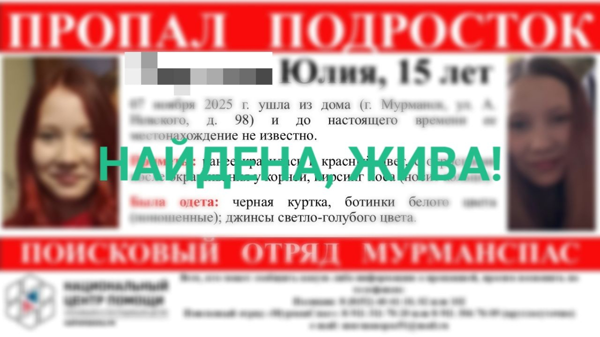 15-летнюю Юлию П., которая пропала в пятницу, 7 ноября, в Мурманске, нашли. Она жива, информируют волонтёры поисково-спасательного отряда «МурманСпас».