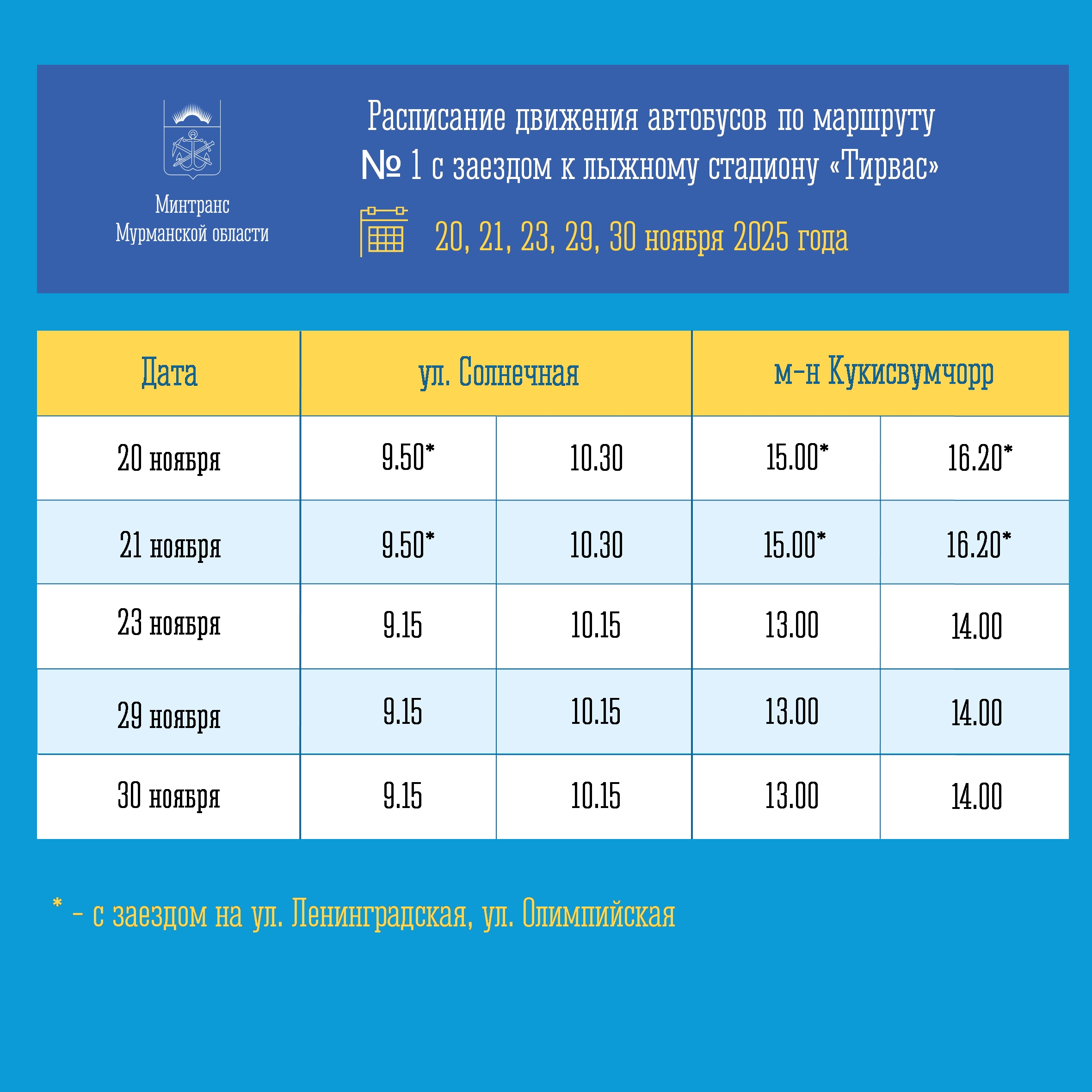 «В связи с проведением Всероссийских соревнований по лыжным гонкам «Хибинская гонка», а также I этапа Кубка России по лыжным гонкам 20, 21, 23, 29 и 30 ноября будут организованы заезды к стадиону «Тирвас» по маршруту № 1 «ул. Солнечная — ул. Ленинградская — м-он Кукисвумчорр» (г. Кировск)», — говорится в сообщении.