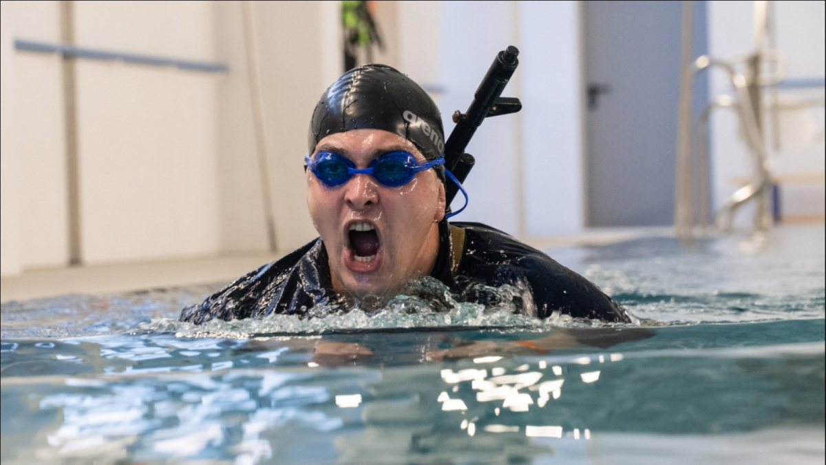 Перед участниками стояла непростая задача: для получения первого спортивного разряда проплыть 100 метров в военной форме с автоматом не более чем за 2 минуты 20 секунд. С ней справились 40 пловцов.