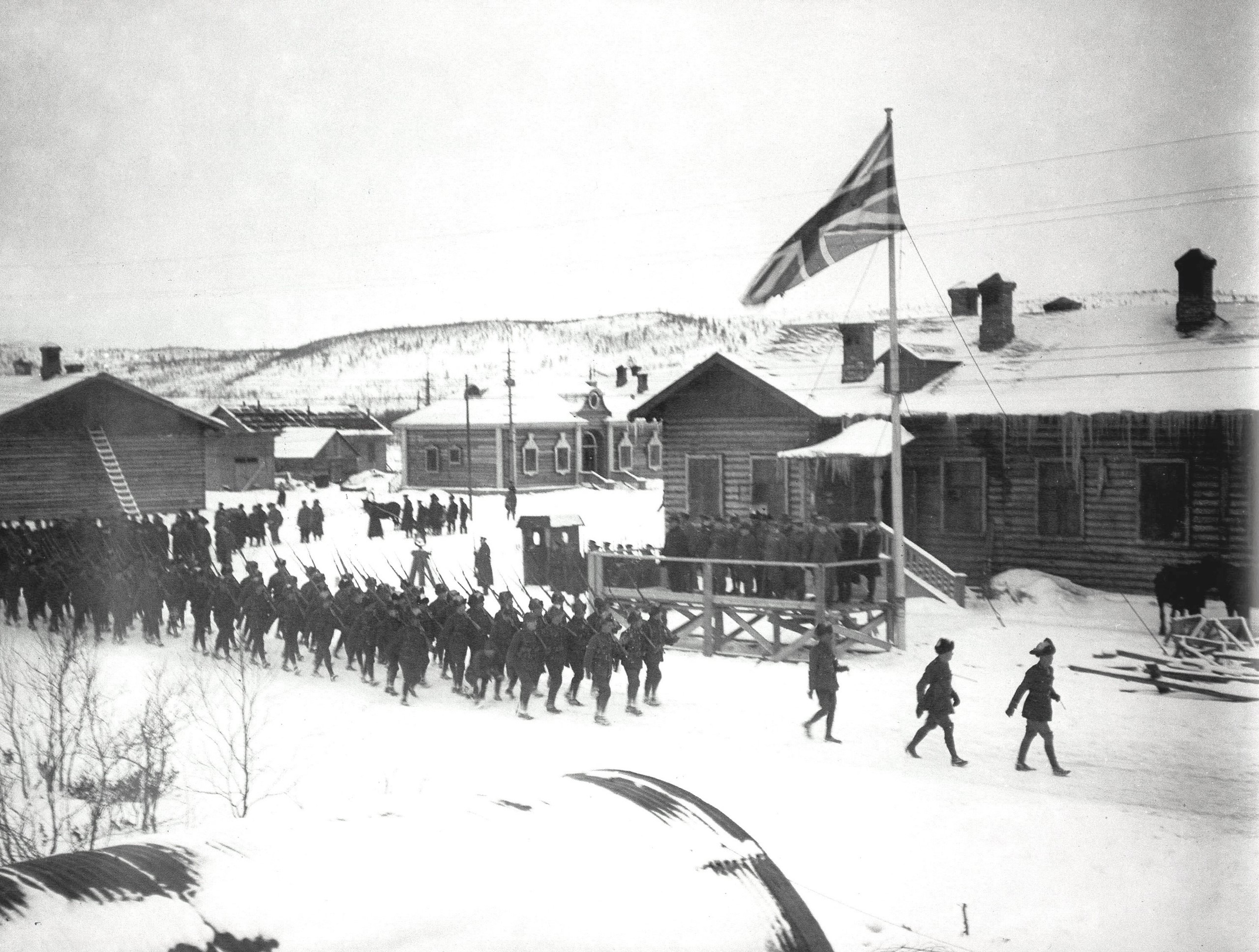 11 ноября 1918 года окончилась Первая мировая война. Так как Мурманск играл немалую роль в этой войне, к слову, благодаря которой он и возник, и в ноябре 1918 года был одним из центров сосредоточения военного контингента стран -победительниц, это событие отмечалось торжественно. В параде принимали участие размещённые в Мурманске части английских, французских и итальянских войск, а также взвод русских белогвардейцев. Были подняты флаги России и стран Антанты. К началу парада прибыл командующий союзными силами генерал-майор Мейнард с помощником генерал-губернатора Северной области по управлению Мурманским районом Ермоловым В.В.