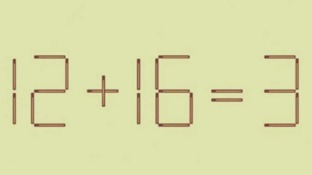На изображении вы видите выражение «12+16=3», составленное из палочек. Тут есть ошибка. Ваша задача — переставить куда-то всего одну спичку так, чтобы это уравнение стало верным.
