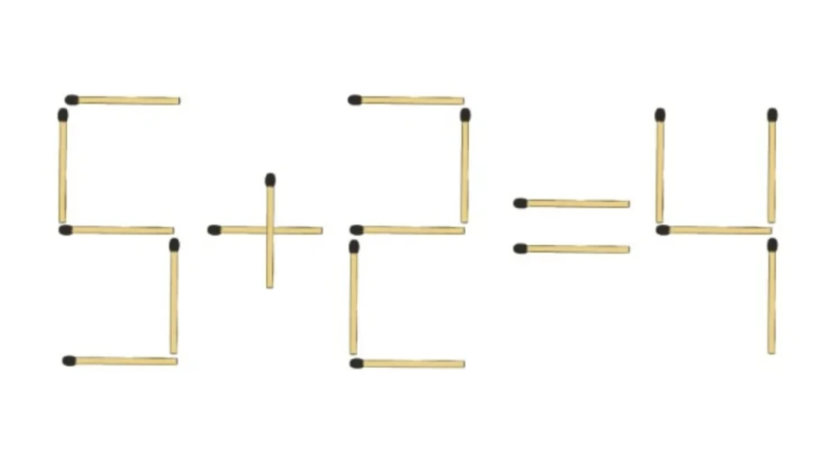 Посмотрите на картинку, на ней спичечный пример «5+2=4». В нём допущена ошибка. Чтобы всё стало правильно, нужно лишь переложить одну спичку на новое место.