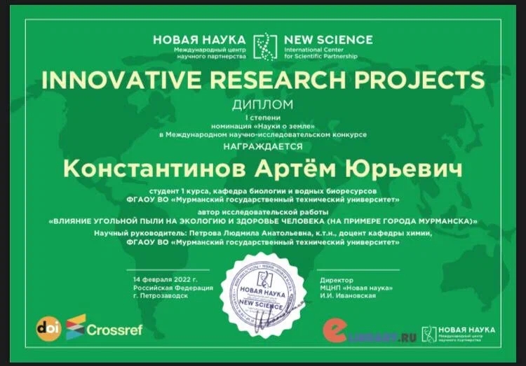 Артем Константинов, судя по многочисленным наградам и дипломам, неплохо учился, участвовал от рыбопромышленного колледжа в квизах и даже побеждал в составе команды. А позже, поступив на биологический факультет в МГТУ, занимался научными исследованиями. За одно из таких — «Влияние угольной пыли на экологию и здоровье человека (на примере Мурманска)» — получил диплом первой степени международного конкурса.
