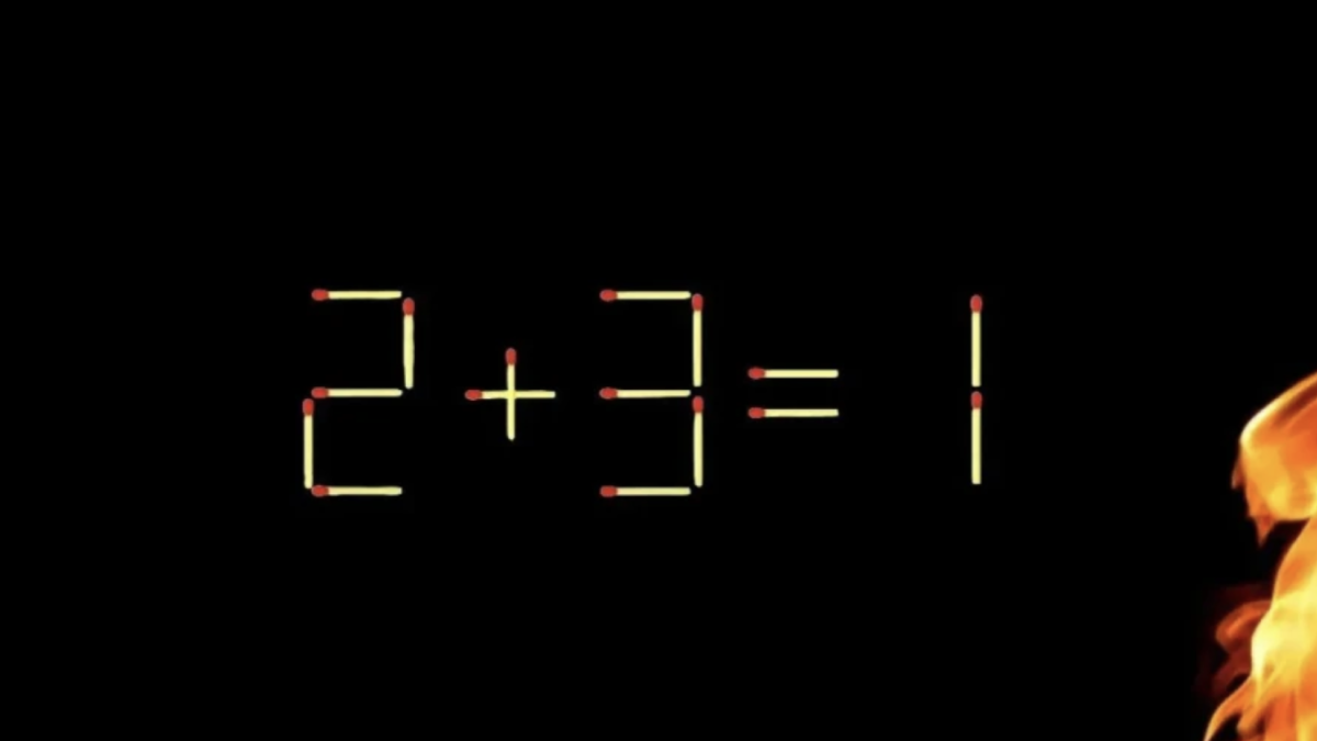 Посмотрите на картинку с палочками. Перед вами пример «2+3=1». Что-то не так. Нужно переложить куда-то всего 1 спичку, чтобы равенство стало верным. Подумайте.