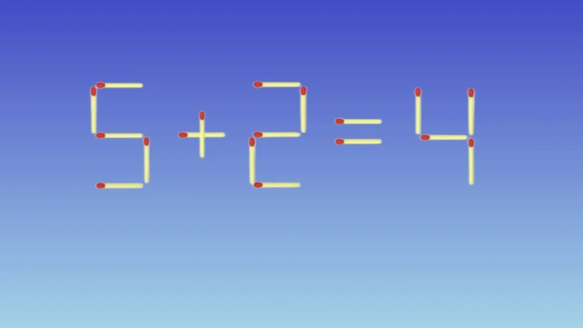 На картинке пример «5+2=4». Это неправильно. Вам нужно переложить 1 спичку так, чтобы пример стал верным и порадовал Дедушку Мороза.