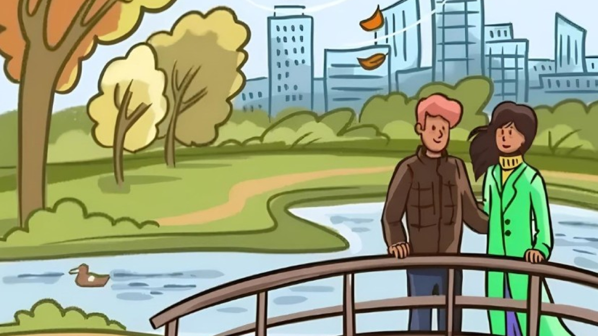 На первый взгляд на картинке все нормально. В парке на мосту стоит парочка. Падают осенние листья, но от картинки веет теплом — видно, что у людей есть симпатия.