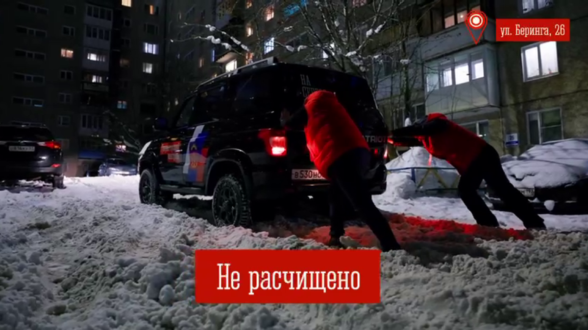 Судя по кадрам, группа инспектировала дворы на Беринга и застряла в снежной каше. Так что УАЗ «Патриот» пришлось выталкивать. Но и на Книповича ситуация повторилась. Стоит отметить, что машина отличается повышенной проходимостью, и если уж она не смогла проехать во дворе, то простым легковым автомобилям там делать нечего.