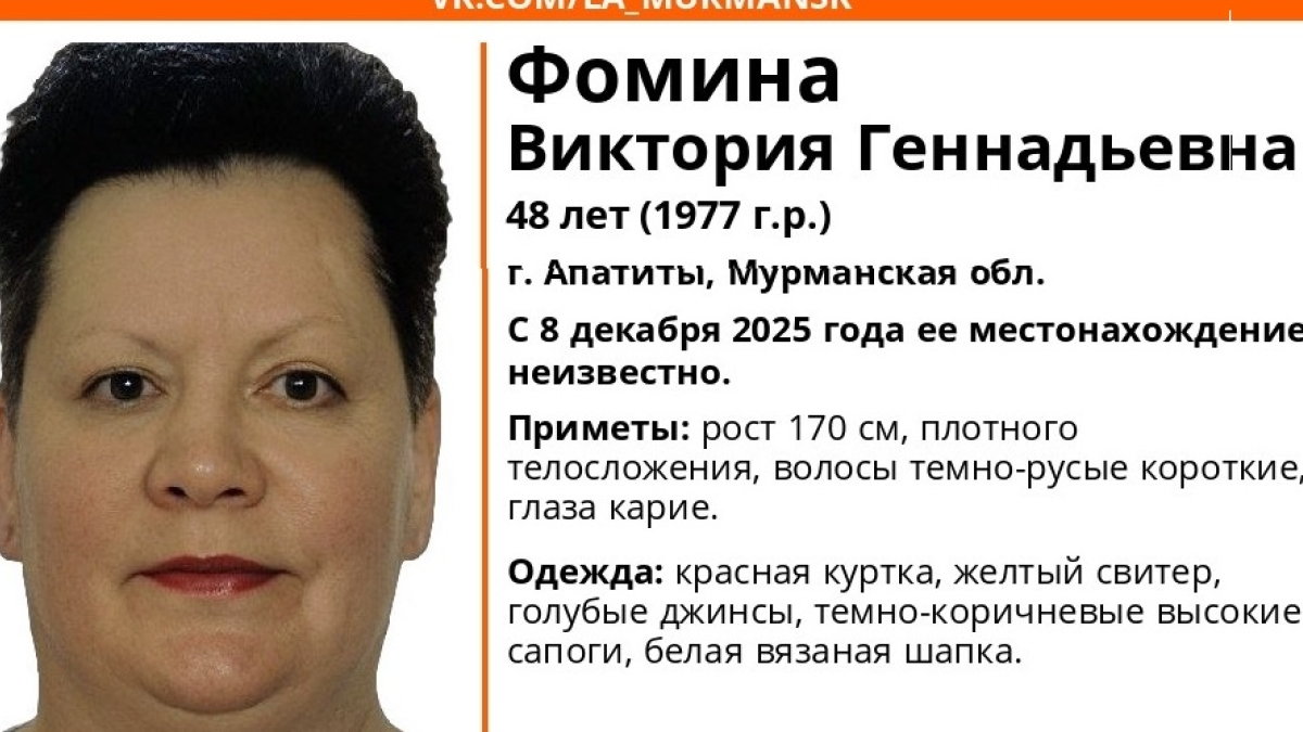 В Мурманской области пропала без вести 48-летняя Фомина Виктория Геннадьевна. О ней ничего неизвестно с 8 декабря.