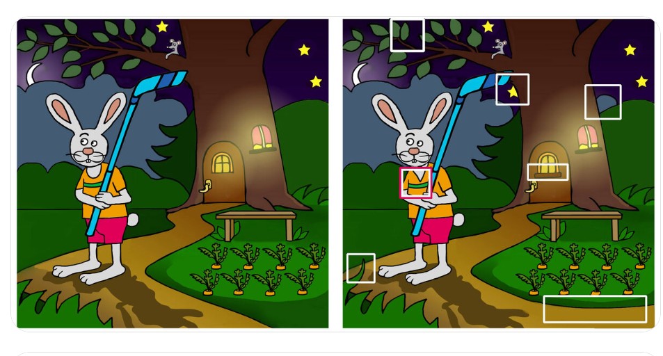 На рисунках изображён заяц, который бдительно охраняет свои морковки. Вам нужно найти на картинках 7 отличий.