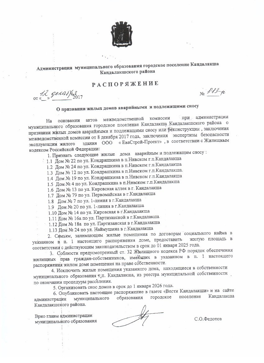 «Формирование программы осуществляется на уровне Министерства строительства Мурманской области. На текущий момент в программу переселения граждан из аварийного жилищного фонда, признанного таковым после 01.01.2017, многоквартирные дома, расположенные на территории Кандалакшского округа, не включены», — ответили чиновники. Несмотря на то, что срок заседения жильцов по распоряжению - до 1 января 2025 года.