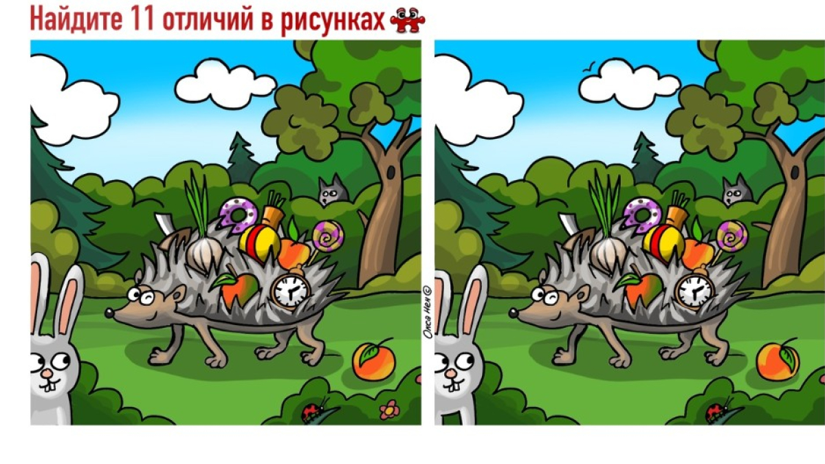 Картинки с ежом — это головоломка. Нужно найти на рисунках 11 отличий. Придётся быть внимательным.