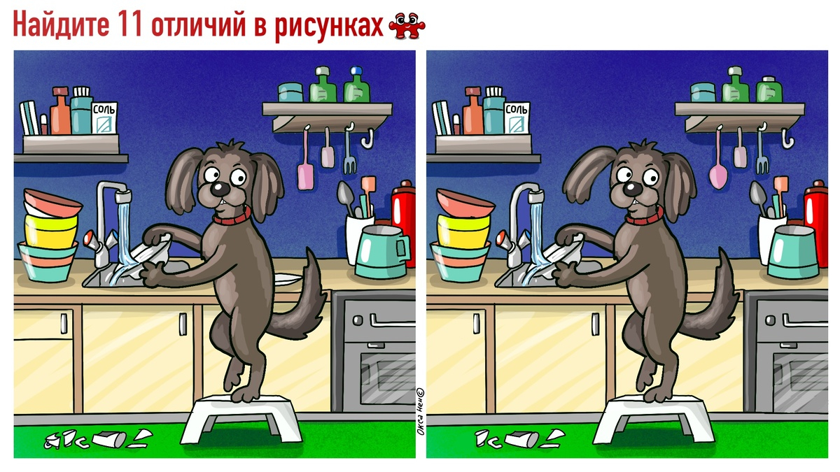 На рисунках, на которых нужно найти 11 отличий, изображён забавный пёсик. Старательный друг человека моет посуду — настоящий помощник!
