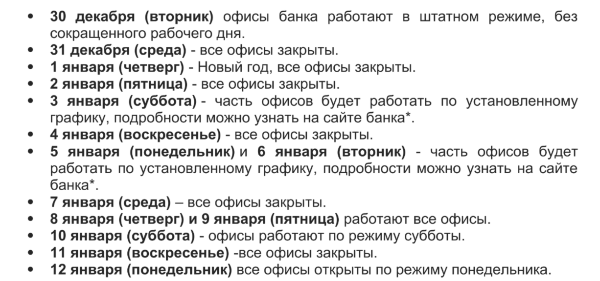 С 31 декабря по 2 января — отделения Сбера в Мурманской области будут на "каникулах". А вот 3 января часть из них уже откроют для клиентов. С режимом работы не все так просто: для каждого офиса он свой. Проще всего проверить это на сайте финансовой организации или в мобильном приложении. Там же можно найти информацию по пролонгации вкладов, которые заканчиваются в период январских праздников, и по списанию платежей по кредитам.