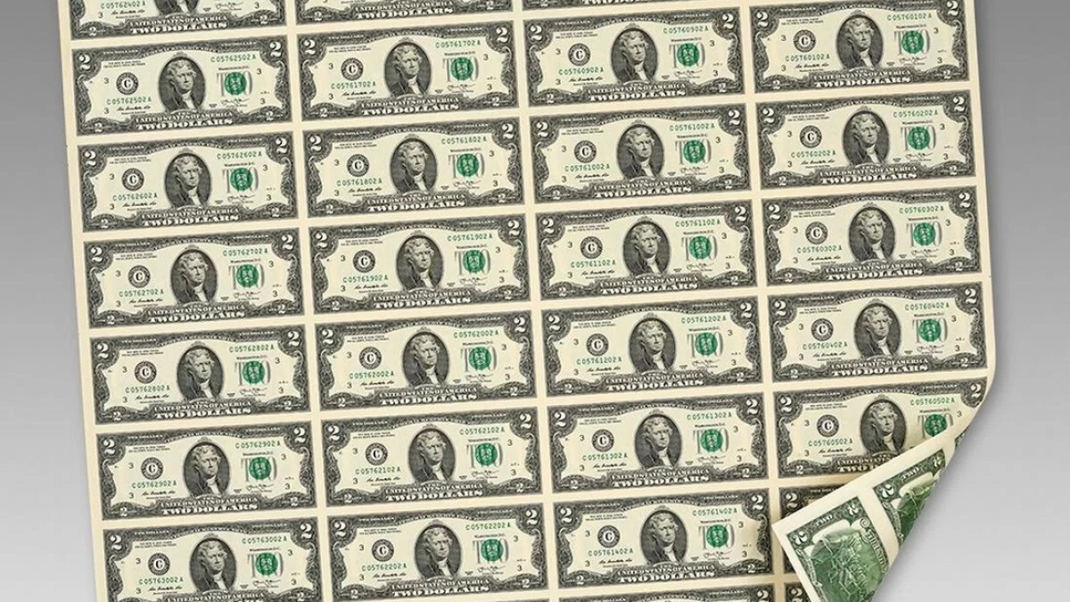 «Неразрезанный коллекционный лист из 32 купюр настоящих долларов США. Номинал 2$. Привезён из США. В таком виде лист выходит из печатного станка Федерального резерва. Имеет нумизматическую ценность!», — пишет продавец на сайте объявлений.