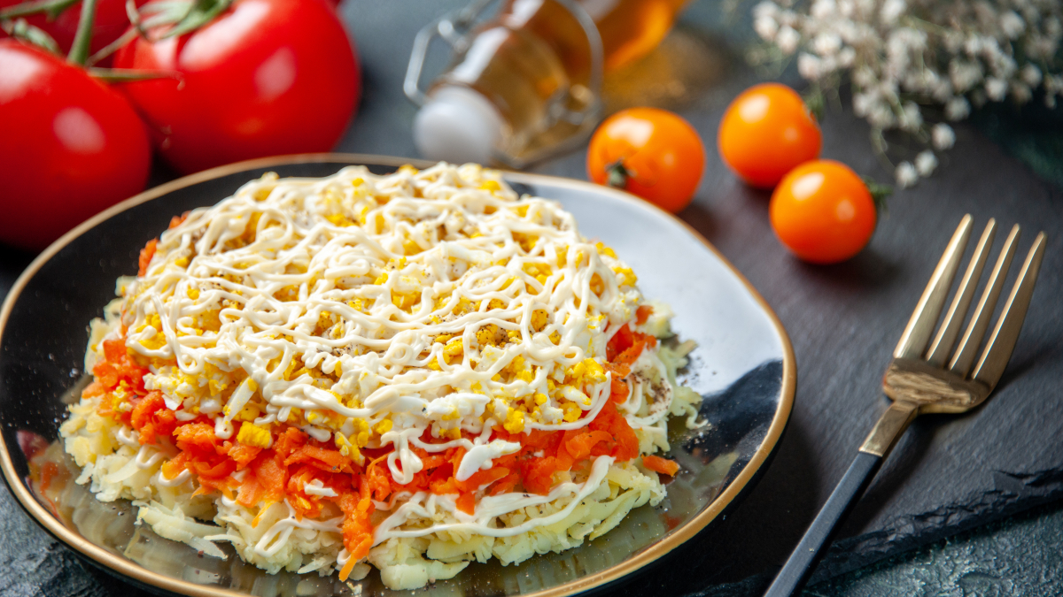 4. Сеточка майонеза, а наверх — тёртая морковка. Сделать вкус моркови не таким ярким поможет лимонный сок.