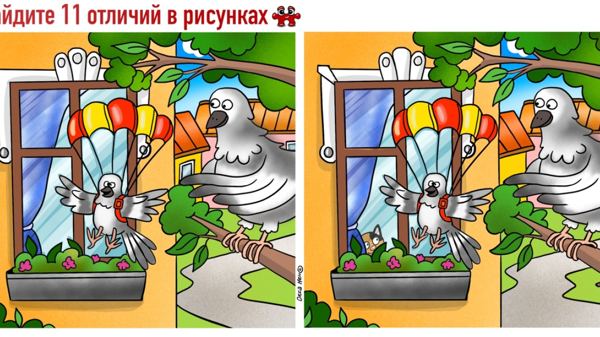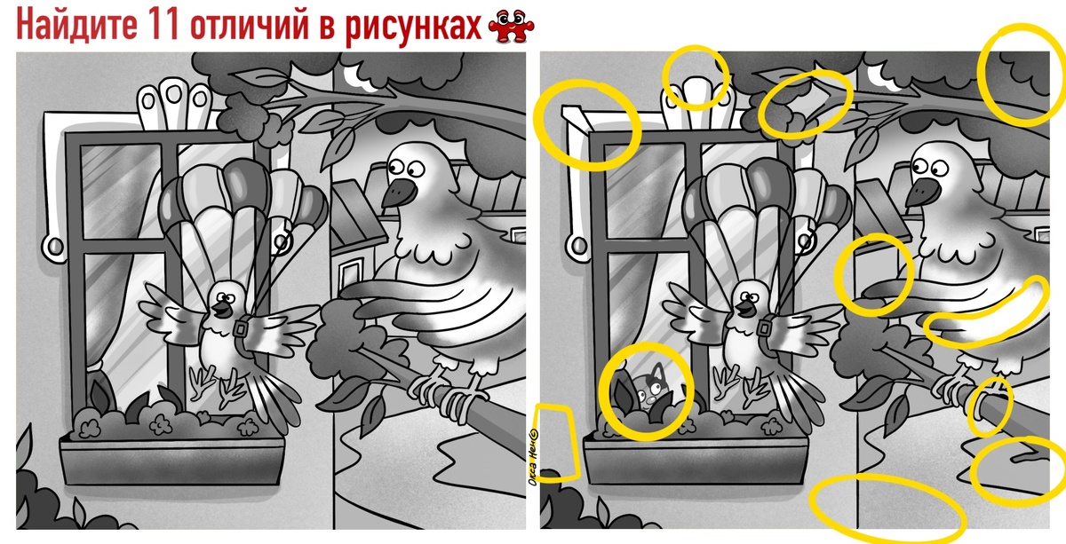 На рисунках иногда бывают достаточно непонятные, а то и бредовые сюжеты. Например, вы можете себе представить птицу с парапланом или парашютом? Вот и я не могла, пока не увидела рисунки, на которых надо найти 11 отличий.
