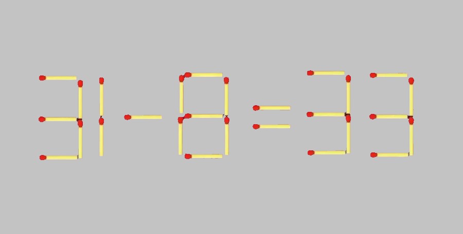 Как вы понимаете, пример «31 - 8 = 33» далёк от реальной математики. Ваша задача состоит в том, чтобы исправить запись, передвинув всего одну спичку на другое место. Это надо сделать так, чтобы превратить неверное уравнение в арифметически обоснованное.