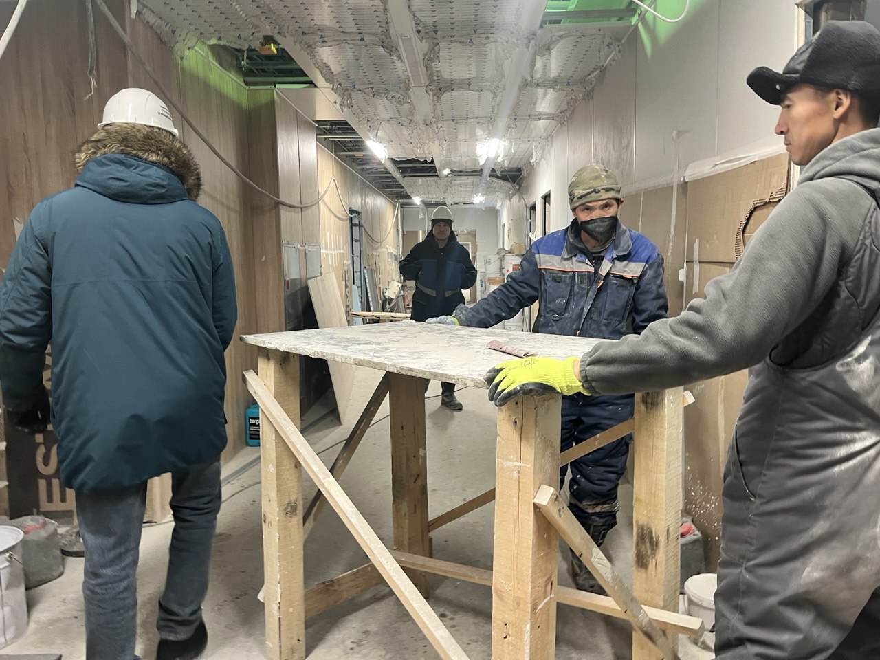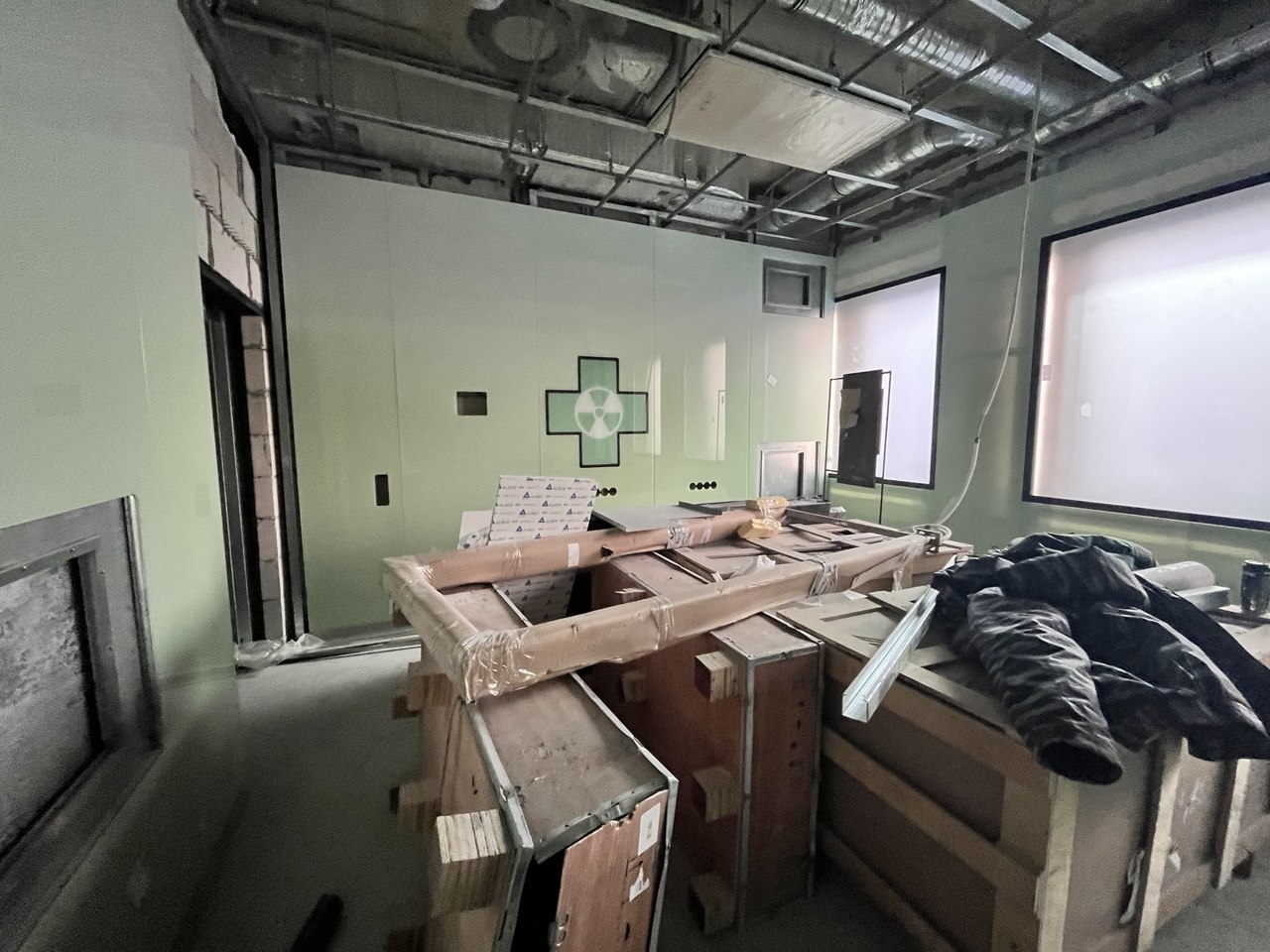 Сейчас рабочие занимаются укладкой плитки, установкой стеновых и потолочных панелей, занимаются ограждениями лестниц, а в инновационных операционных блоках монтируют стеклянные перегородки.