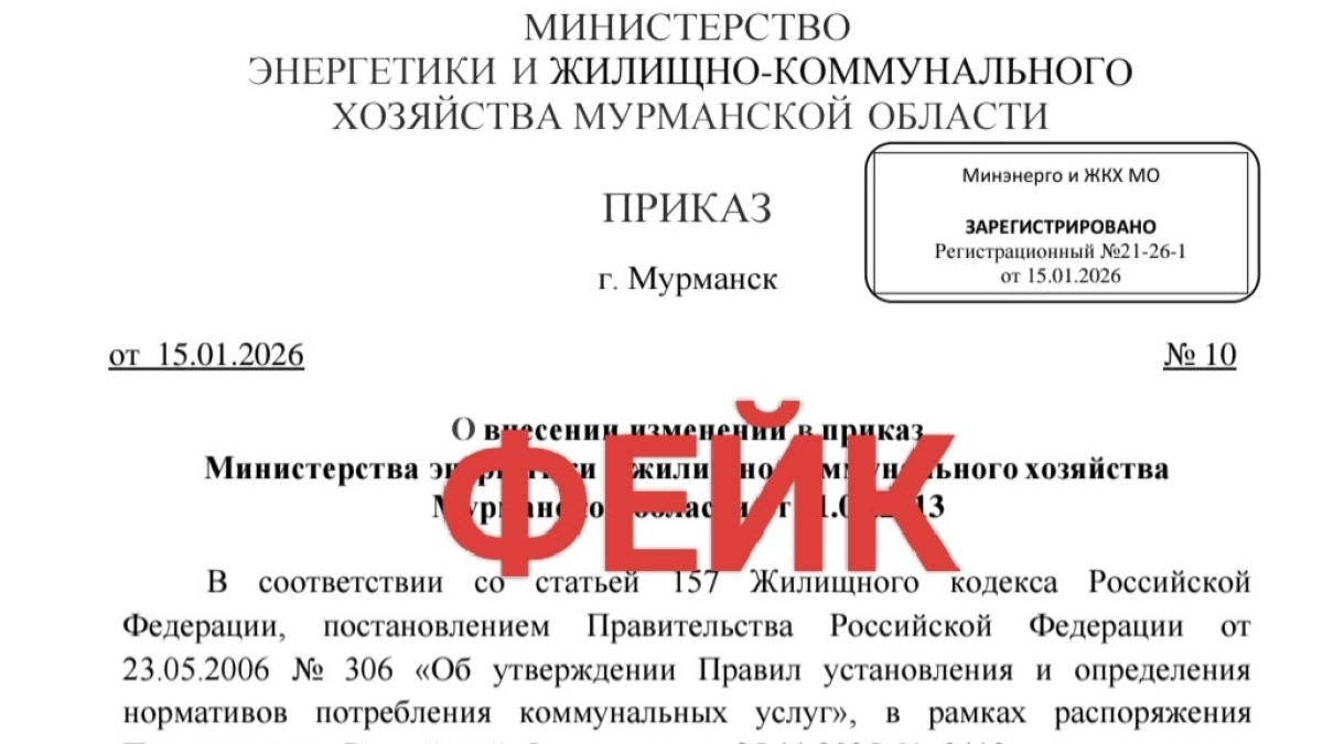 Приказ якобы подписала 15 января текущего года министр энергетики и ЖКХ Мурманской области Зинаида Середа. В фейковом документе говорится о том, что температурные параметры при отопительном сезоне в многоквартирных домах будут снижены на 5 градусов.