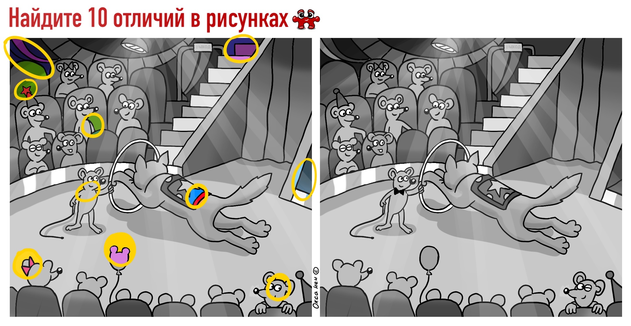 У меня не вышло найти 10 отличий. Не обратила внимания на глаз одной из мышей. Если у вас тоже что-то пошло не так, смотрите на рисунок с подсказками.