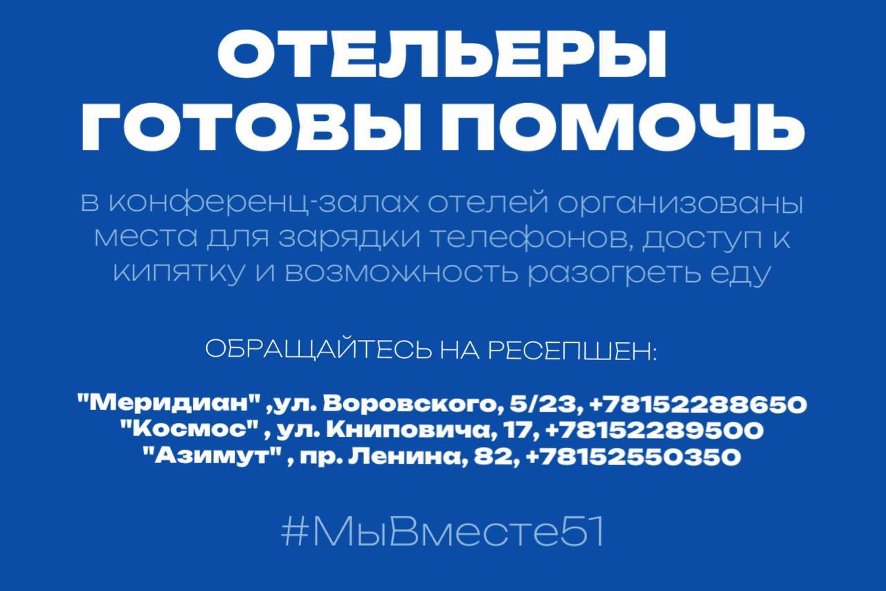 Глава города Иван Лебедев в своём Telegram-канале опубликовал список мест в Мурманске, где можно зарядить телефон, подогреть еду и набрать воды. Впрочем, многие магазины, вынужденные из-за перебоев со светом закрыться накануне вечером, уже работают. Так же оперштаб региона опубликовал и список предпринимателей из сферы общепита, готовых предоставить людям скидки на свои товары. Помощь оставшимся без ресурсов людям готовы оказать и в отелях — «Космос», «Меридиан» и «Азимут». Там также есть доступ к кипятку, микроволновкам, чтобы разогреть еду. А семьи с маленькими детьми могут обратиться за временным размещением.