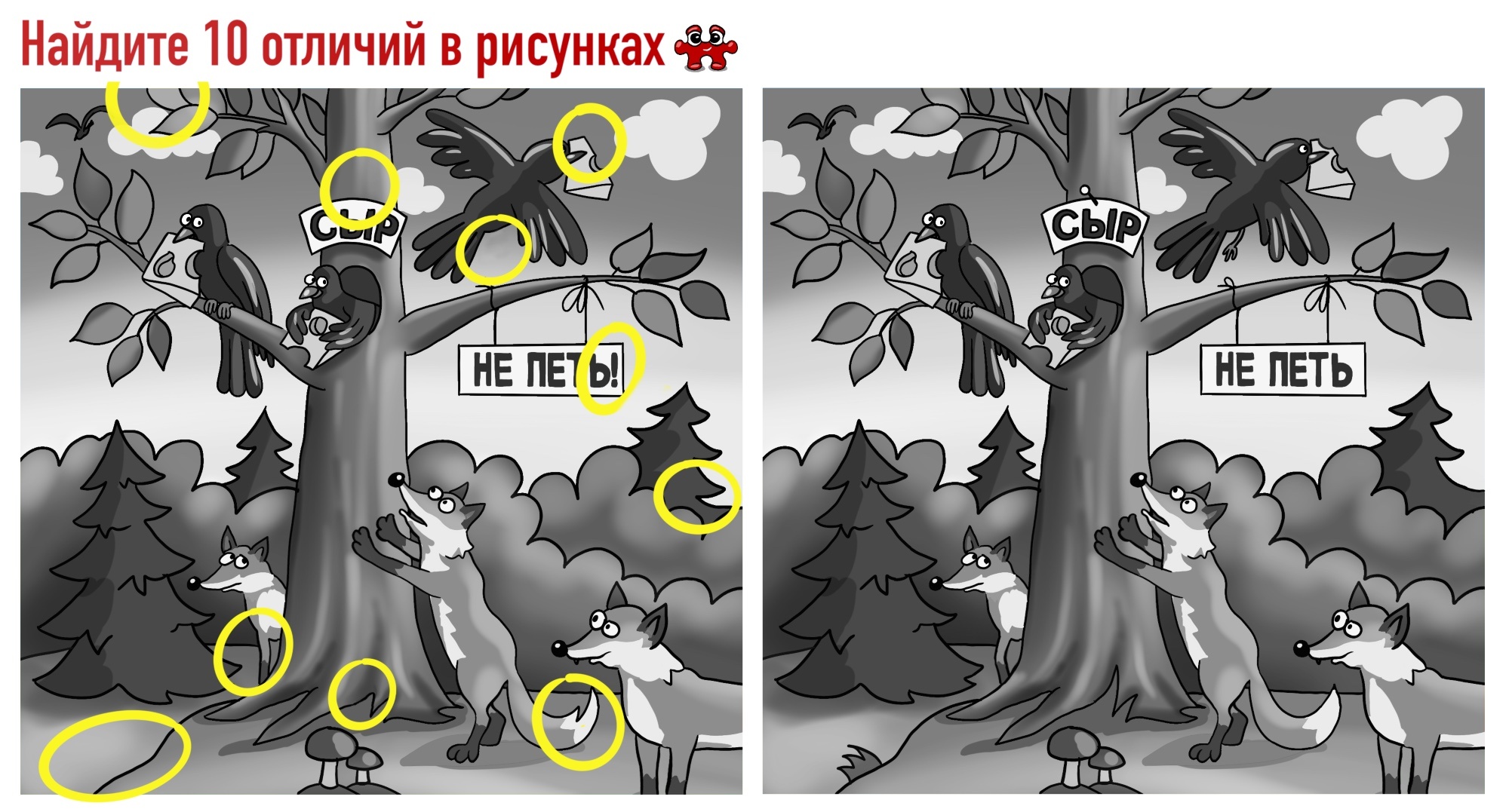 Об этом напомнили шуточные рисунки художника, на которых нужно найти 10 отличий. Там изображены вороны на дереве и лисицы под ним.