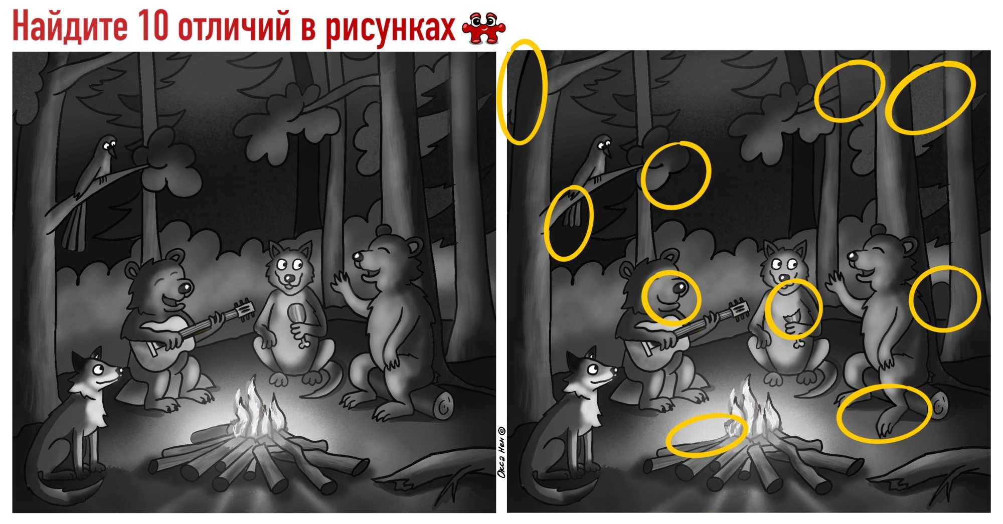 На рисунках, где надо найти 10 отличий, лесные звери отдыхают там же, где живут. Собрались на опушке леса и балдеют.