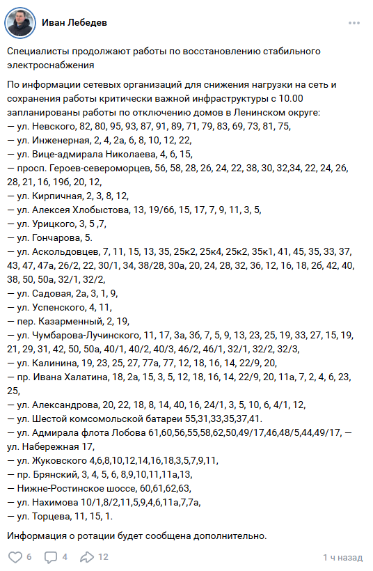 «Проводим переключения потребителей, чтобы минимизировать время перебоев электроснабжения. Бригады работают круглосуточно, чтобы полностью восстановить сеть как можно скорее. Приносим свои извинения за неудобства», — сообщают «Россети».