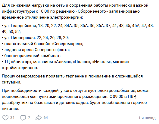 Сегодня северян ждут масштабные отключения — это мера, необходимая для восстановления нормальной подачи электроэнергии. Списки адресов в своих социальных сетях опубликовали главы городов Мурманска и Североморска — Иван Лебедев и Владимир Евменьков.