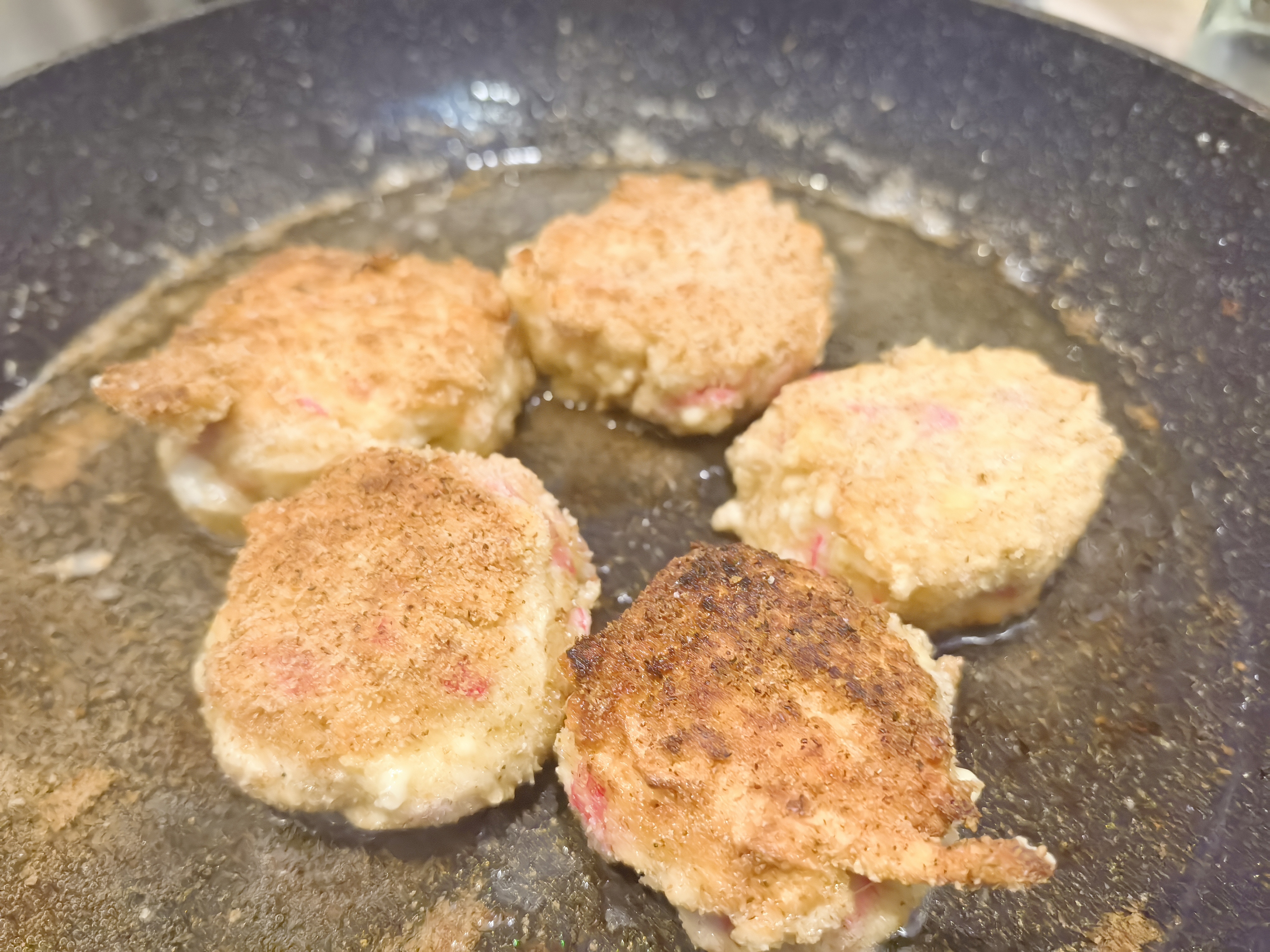 Все перемешиваем и формируем котлетки из получившегося фарша, панируем в яйце, муке и сухарях. Эконом-вариант допускает панировку только в сухарях. И отправляем на разогретую сковородку с растительным маслом.