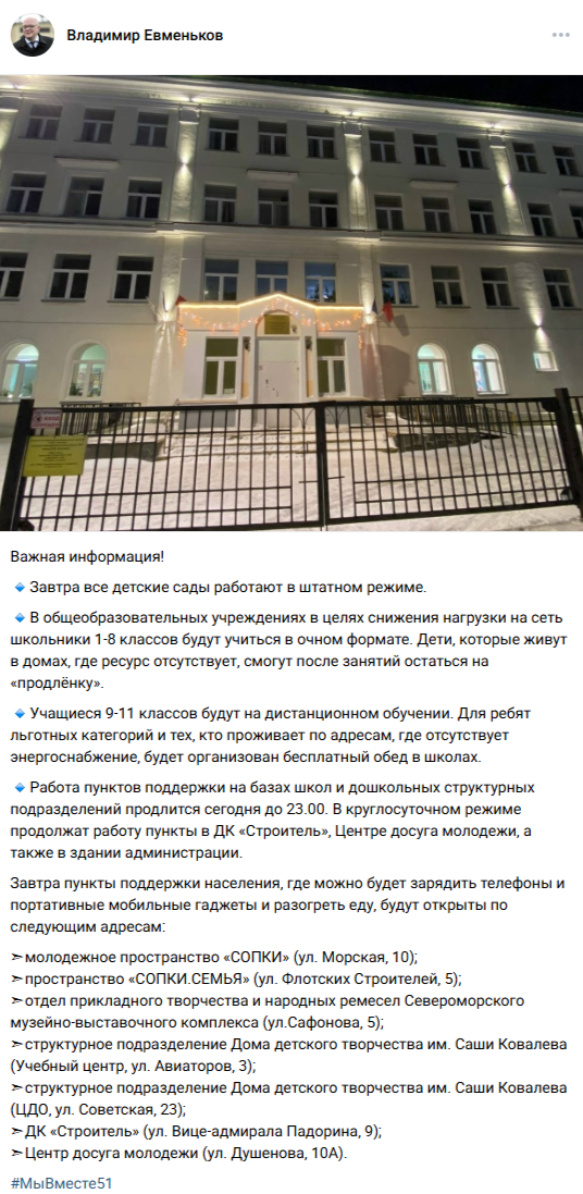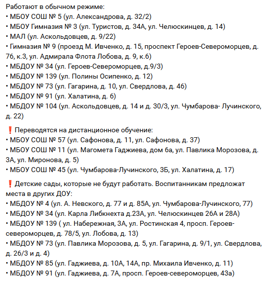 Глава Североморска Владимир Евменьков также опубликовал график работы образовательных учреждений: