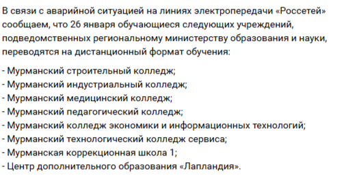 Также в Министерстве образования и науки Мурманской области сообщили о том, что МАУ в понедельник 26 января работает в штатном режиме и опубликовали график для колледжей и техникумов Мурманска: