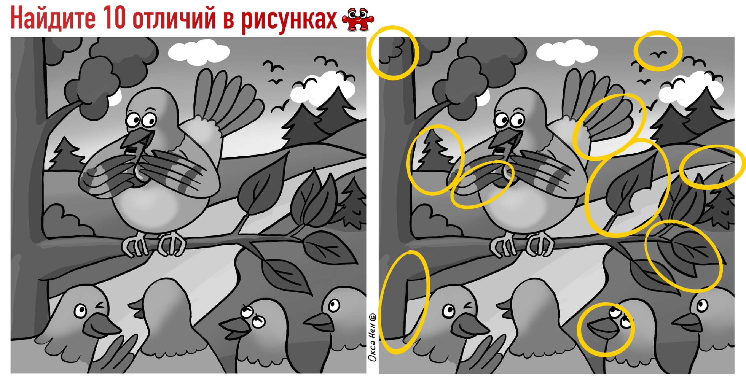 Найдите 10 отличий на рисунках с птицами